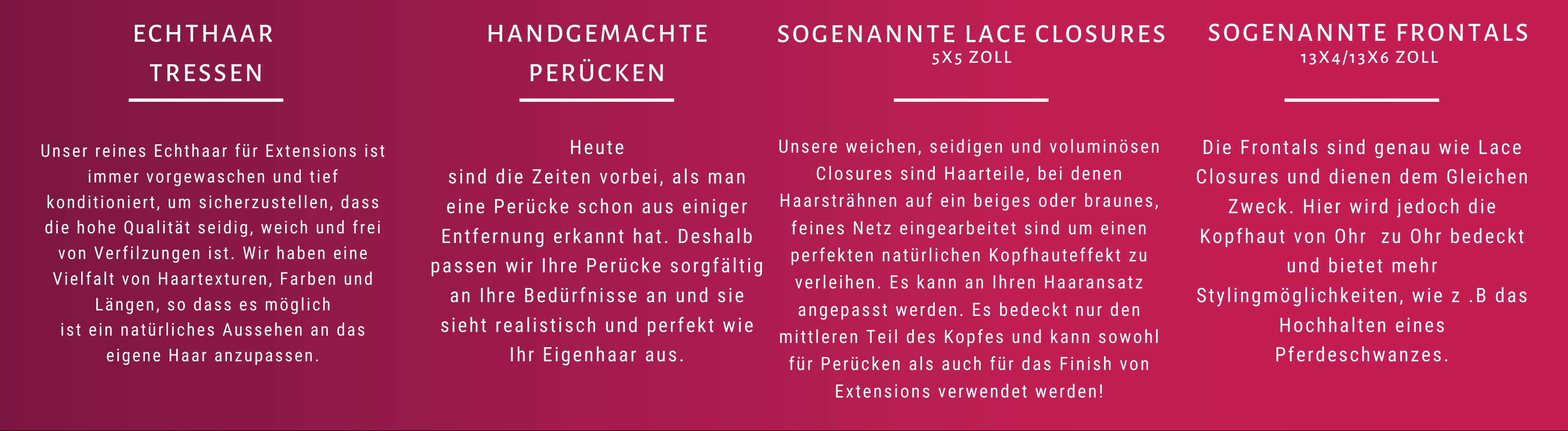 In unserem Salon bieten wir Ihnen exquisite Haarpflege zu fairen Preisen, natürliche Haarverdichtung, seidige Extensions und nicht zuletzt hand-und maßgefertigte Perücken! Mit unseren hochwertigen Premium-Echthaaren aus Europa, Malaysia, Vietnam, Brasilien und Indien, geben wir Ihnen das Versprechen Sie nicht zu enttäuschen.