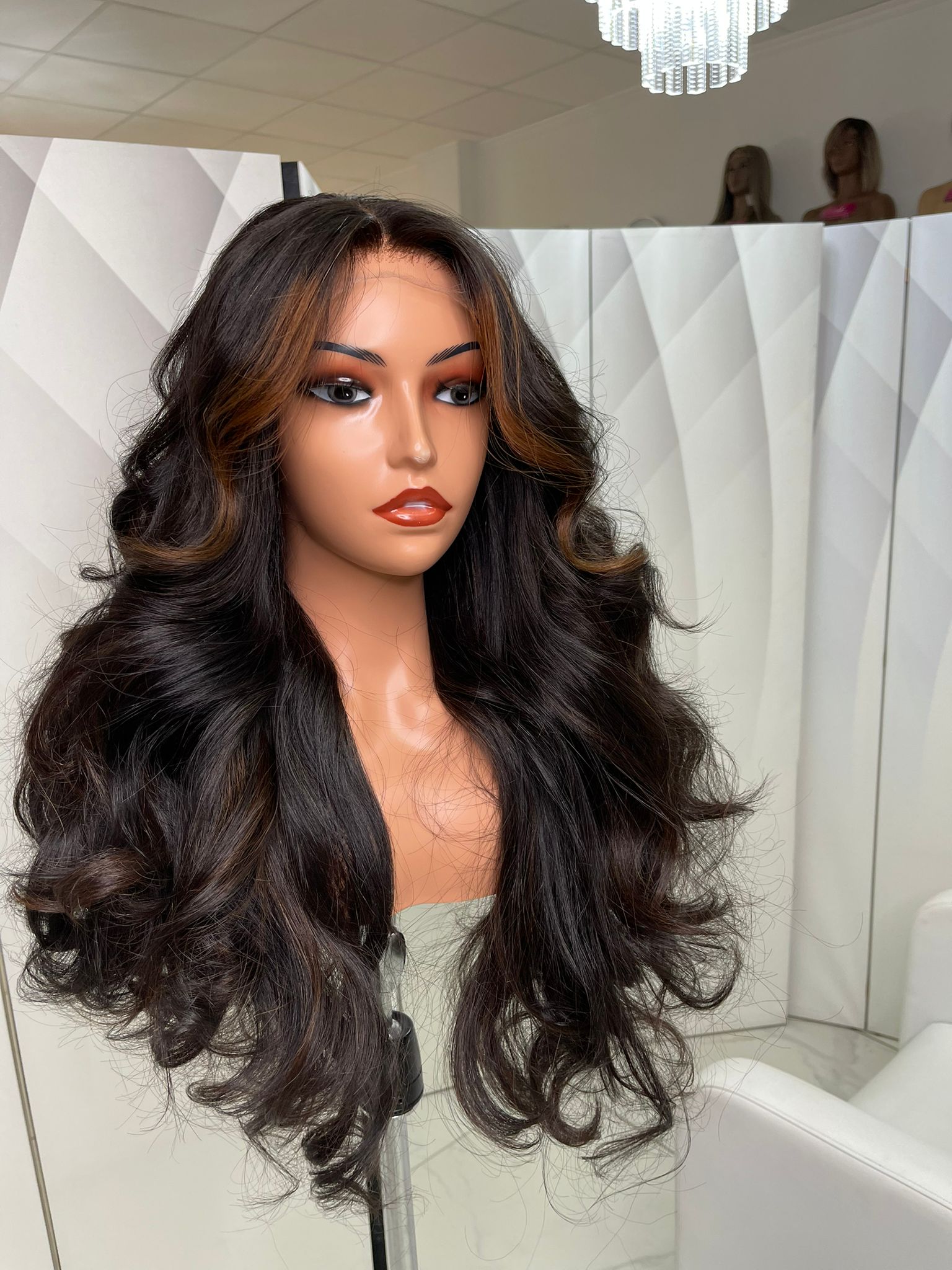 Glamorous and bold! Our Crown Mel has a beautiful deep brown tone with honey brown highlights at the front and a lovely medium length. For this model, we used 400 g of premium hair and a 5×5 closure. This high-quality wig is available in cap sizes S, M, or L. Please specify your preferred size when placing your order. Would you like a different color or length? No problem, we can customize this beautiful crown for you. Simply send us an email before placing your order.